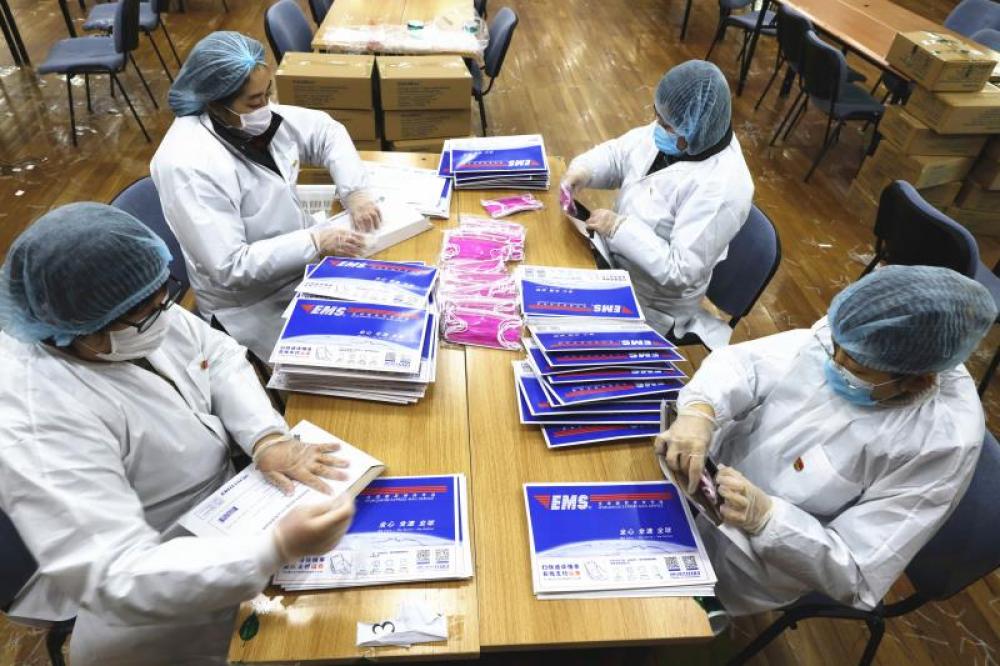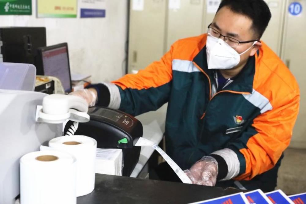 在青岛各区市邮政公司揽投部,邮政工作人员根据政务网接收的投递信息认真核对,并打印快递单,依次粘贴在装着口罩的快递袋上,然后根据地址分配给负责相应投递段道的投递员。