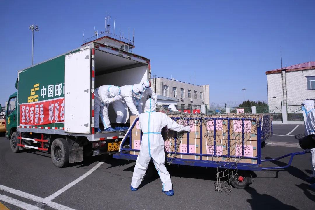 为及时将抗疫物资运送到绥芬河,黑龙江省邮政分公司召开紧急会议,相关负责人赶赴哈尔滨、牡丹江两大机场一线指挥,并迅速组织哈尔滨邮区中心局和牡丹江市邮政分公司展开航班物资接卸及陆路运输工作。哈尔滨邮区中心局接到通知后第一时间着手调配4台22吨的邮政货车,牡丹江邮区中心局紧急调配12吨、8吨、4吨等共10台邮政货车承担运输任务。