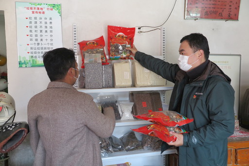 王琪珑(右)帮助福禄村村民展示当地特色农产品。