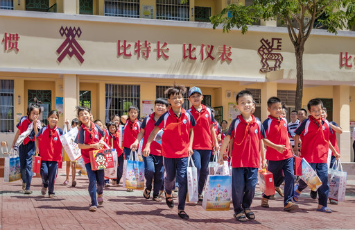 图为5月30日,海南省分行工会为琼中县湾岭镇加章村小学送去慰问品,与小学生共同庆祝“六一”儿童节。 □符德勇 摄影报道
