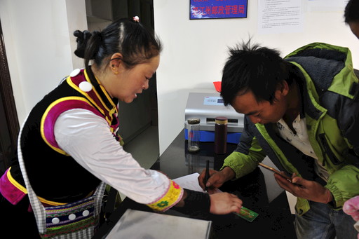 在外出投递时,桑南才的妻子蜜晓琴就成为他得力的工作助手,当起了称杆邮政所的临时“营业员”。“这里必须有人,如果客户来到这里却没人,让他们在这里等着也不好,所以我就过来帮他们办理一些业务。”