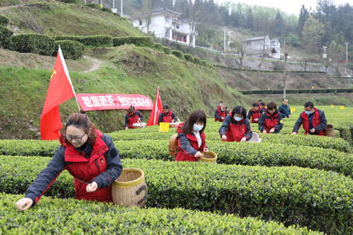 组织党员帮茶农采春茶,湖北邮政助力农产品销售呈现多维度、全方位的格局。向旭晖 摄