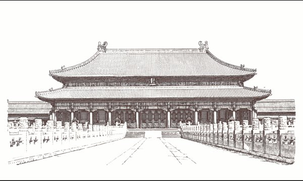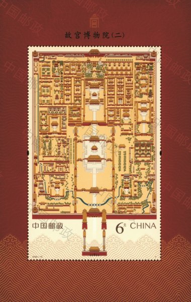 紫禁城建造技艺高超,内在考究精妙,外在磅礴大气,代表着当时最高的建造水平。中央轴线上分布着三大殿(太和殿、中和殿以及保和殿)和后三宫(乾清宫、交泰殿以及坤宁宫),左右两条次轴线上分别分布着慈寿宫、宁寿宫等宫殿。出于防御需要,宫殿建筑外围筑有宫墙,四周分布有角楼,外有护城河环绕。故宫平面示意图首次登上邮票,细腻、完整地呈现了故宫恢弘的建筑布局。