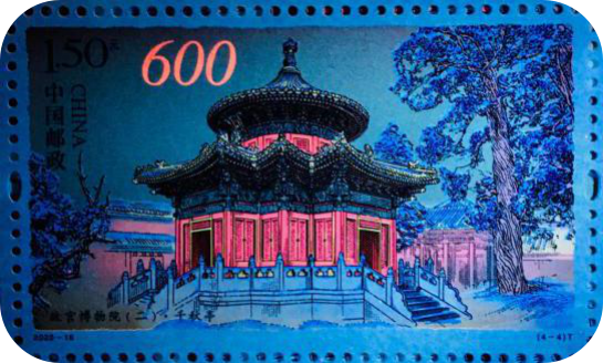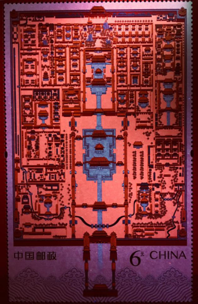 小型张采用特种金油墨印制纹饰图案,烘托故宫的尊贵大气。在故宫平面示意图中的地面部分,专门覆盖了一层无色变金色珠光油墨和荧光油墨,在特定光照和角度下观看,地面与建筑层次分明。