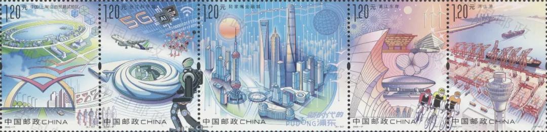 30年来,浦东在一片阡陌农田上建成了一座功能集聚、要素齐全、设施先进的现代化城市,成为我国改革开放的象征和上海现代化建设的缩影。历史是发展的见证,邮票是时代的剪影。此次发行的《新时代的浦东》特种邮票,鲜活呈现了浦东勇担国家战略、奋进新时代的生动实践,有力彰显了中国特色社会主义的强大生命力。邮票一套5枚,选取上海自贸试验区、张江科学城、陆家嘴金融城、浦江东岸、洋山港等作为表现主题,将浦东日新月异的变化浓缩于方寸之间。