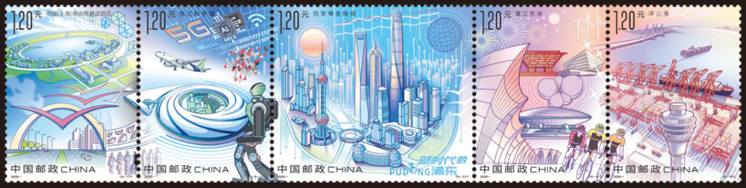 《新时代的浦东》是为纪念上海浦东开发开放30周年,由香港知名设计师韩秉华设计,中国邮政发行的一套5连票。这是继1996年发行《上海浦东》邮票后,时隔25年再次发行的上海城市题材邮票。