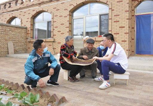 在易地搬迁安置房外,邮政员工与村民焦世文(戴帽者)商讨致富途径。