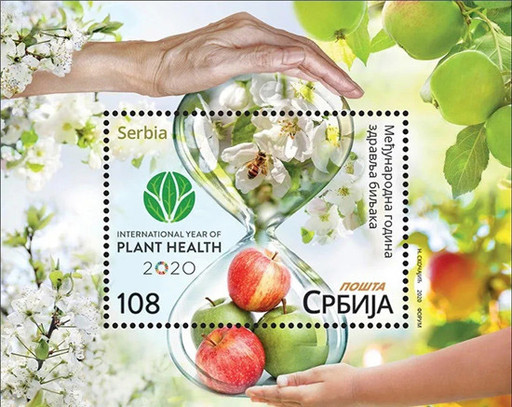 为提高大众和政策制定者对植物健康重要性的认识,以实现可持续发展目标,2020年定为“国际植物健康年”。在第二季度中,不少国家都发行了“国际植物健康年”邮票,如吉尔吉斯斯坦邮政和塞尔维亚邮政分别于4月4日和4月22日发行;韩国邮政的邮票图案为因健康植物而美好的自然环境,整张内含邮票16枚,边纸图案为植物茎叶;拉脱维亚邮政的邮票以开花的植物与拉脱维亚文版IYPH标志为图案,整张内含邮票10枚,上下各5枚对倒印制。