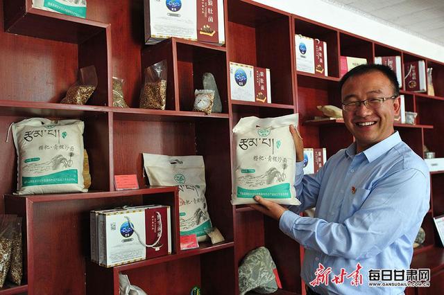 邮储银行甘肃省分行扶贫工作办公室高级副经理、碌曲县阿拉乡吉扎村驻村帮扶工作队队长兼第一书记齐斌展示扶贫车间生产的青稞炒面