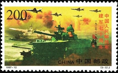 1997年8月1日,中国邮政发行了1997-12《中国人民解放军建军七十周年》纪念邮票1套5枚,票名分别是“陆军”“海军”“空军”“战略导弹部队”和“陆海空联合演习”5枚邮票,以陆、海、空和战略导弹部队的主战兵器为主图,背景是按兵种按时间有机串联在一条主线上的建军七十年来的重大事件,淡彩的背景与重彩的主图珠联璧合,能够让人自然重温人民解放军七十年的成长历程,真切感受人民军队的现代化步伐。每幅画面虽没有出现一个军人形象,但那隆隆开进的坦克、劈波斩浪的军舰、呼啸而过的战机和腾空而起的导弹,创造了一种千军万马奔腾向前的气势,表现出现代化战争操纵着现代武器与敌人决战千里之外的新特点,收到了此处无人胜有人的艺术效果。