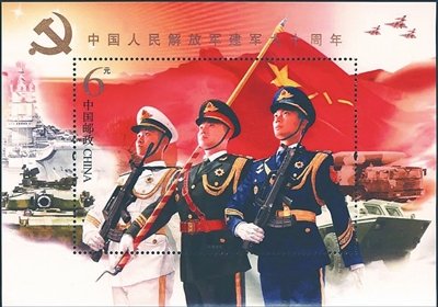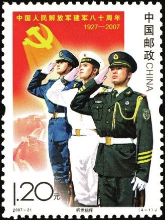 2007年8月1日发行2007-21《中国人民解放军建军八十周年》纪念邮票1套4枚,画面生动表现了中国人民解放军在党的领导下,发扬听党指挥、服务人民、英勇善战的优良传统,刻苦训练、抗洪抢险,参与联合国维和行动,用忠诚和热血捍卫国家主权和安全,筑起共和国的钢铁长城,集中反映出军队建设的新成就和我军忠实履行历史使命的时代风采。