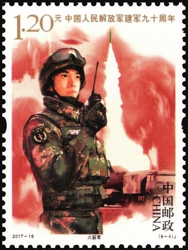 2017年8月1日中国邮政发行了2017-18《中国人民解放军建军九十周年》纪念邮票1套6枚,小型张1枚。图案内容分别为:陆军、海军、空军、火箭军、战略支援部队、武装警察部队,小型张内容为听党指挥。该套邮票展现了中国人民解放军的飒爽英姿和中国军事作战装备的硬件实力,主题鲜明,磅礴大气,画面具有强烈的动感和威严的气势。小型张上军旗飘扬,各军种英姿飒爽,背景衬托各军种高尖端装备,描绘了我军战士联合作战的画面,既表现了中国人民解放军威武雄壮的军容和现代化水平,也体现出党的十八大以来,人民军队在新时代强军目标指引下所取得的巨大成就。