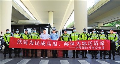 7月29日上午,中邮保险河南分公司开展夏日送清凉活动,为郑州交警一大队铁骑中队送去矿泉水、洗漱用品等防暑降温物资,对他们坚守岗位、无私奉献表示亲切慰问,为保障辖区道路交通安全所付出的辛勤劳动表示感谢。