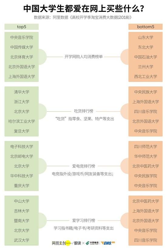 根据往年的数据,大学开学季,中国高校大学生网购消费,往往会达到一个小高峰。阿里数据则显示,开学网购人均消费高校榜单中,中央音乐学院、中国传媒大学、北京体育大学,以最高的人均消费排名前三。