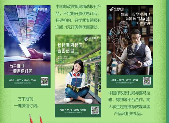 面对高校学生,还有各类文艺杂志、报刊优惠订阅服务,万千期刊,均能微信一键订阅。中国邮政微邮局精选报刊产品,更是不定期开展优惠订阅、扫码抢购、开学季专题报刊订阅、1元订阅等优惠活动!甚至还联合喜马拉雅、得到等平台,提供数媒试读和相关礼品,可以说是诚意满满。
