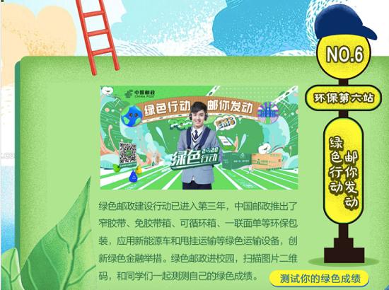 加油第六站,中国邮政倡导和大家一起实行绿色邮政,共创绿色家园。在推广绿色邮政的三年中,中国邮政围绕21项环保指标,不断升级,比如提供窄胶带、免胶箱,使用环保材料,进行环保投递,绿邮行动,邮你发动,快来一起测测你的绿色成绩!