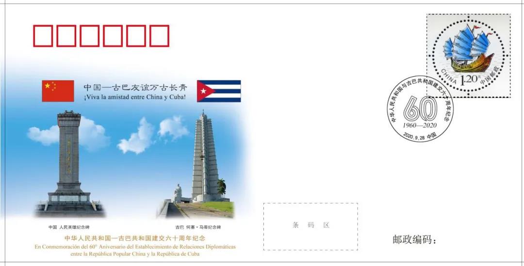 《中国古巴建交60周年纪念封》正面图案采用中国人民英雄纪念碑和古巴何塞·马蒂纪念碑,体现中国和古巴两国不屈不挠争取民族解放的伟大抗争精神。纪念封上所贴邮票为《梦想启航》个性化邮资主图,邮戳体现两国建交年份及建交60周年,纪念封的背面为说明性文字及发行信息。何塞·马蒂是古巴诗人、民族英雄、思想家,他从15岁起就参加反抗西班牙殖民统治的革命活动,42岁便牺牲在独立战争的战场上,他短暂的一生完全献给了争取祖国古巴独立和拉美自由的事业。