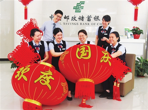 为庆祝新中国成立71周年、欢度中秋佳节,邮储银行海南省分行直属支行员工利用工作之余,买来灯笼、编制中国结,积极营造节日氛围,为争创中国银行业“千家示范网点”再添一把火。