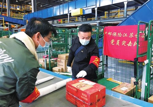 图为中邮保险江苏分公司党员突击队忙碌在邮件装运现场。