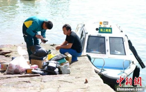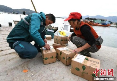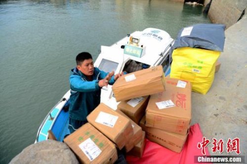 “双十一”刚过,福建省宁德市蕉城区海上邮递员石进全比往常更加忙碌。图为村民到码头领取包裹。