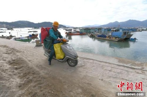 11月12日,石进全开着快艇穿梭在三都澳海上渔村。“双十一”刚过,福建省宁德市蕉城区海上邮递员石进全比往常更加忙碌。作为三都澳海域唯一的海上邮递员,他要服务周边上千户渔排人家以及4座海岛上8个行政村的信件和包裹。石进全的父亲曾摇着橹为乡亲服务了23年,子承父业的他,也已经在这条海上邮路走了20多年。