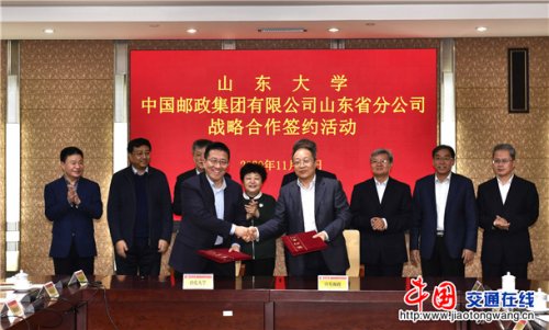 邮政有百年历史,山大是百年老校,百年相伴、携手前行,山东邮政和山东大学合作源远流长,一枚邮票、一封家信、一个包裹、一份报刊、一封录取通知书、都是最真实的见证。2001年10月,为纪念山东大学百年华诞,山东邮政特向国家邮政局申请发行了《教书育人》独立邮资图邮资明信片;2011年10月,山东邮政为山东大学110周年校庆定制了“崇尚学术、追求真理”的个性化主题邮票;2016年11月,在源远流长的校邮合作基础上,在兴隆山校区邮电所,目前已经建设成为集共享寄递、文化生活、金融服务、互联网超市于一体的全新智能综合服务中心,打造成为全国邮政服务校园的“山东样板”;2019年7月,依托“国家名片”独一无二的纪念载体,为山大新生设计制作了全国第一份文创个性化录取通知书。今年又升级策划了“世纪山大、薪火相传”主题录取通知书,得到社会赞誉和广大学子的青睐,彰显了山大“兴教图强、明德日新”的校园精神;2019年10月,双方就申请发行山东大学建校120周年纪念邮票进行了深入的沟通和探讨,共同向中国邮政集团和国家邮政局递交了申请。通过多方努力,已成功纳入“2021年纪特邮票发行计划”,为“山大120周年校庆”增添了浓墨重彩的一笔。此次战略签约是对前期合作的深化和拓展,双方将在宣传和弘扬山大文化、推动邮政普遍服务、搭建创新创业平台、校企联合科技创新、人才培养以及文化建设等方面开展更广泛而深入的合作,共同打造校企合作的新典范。