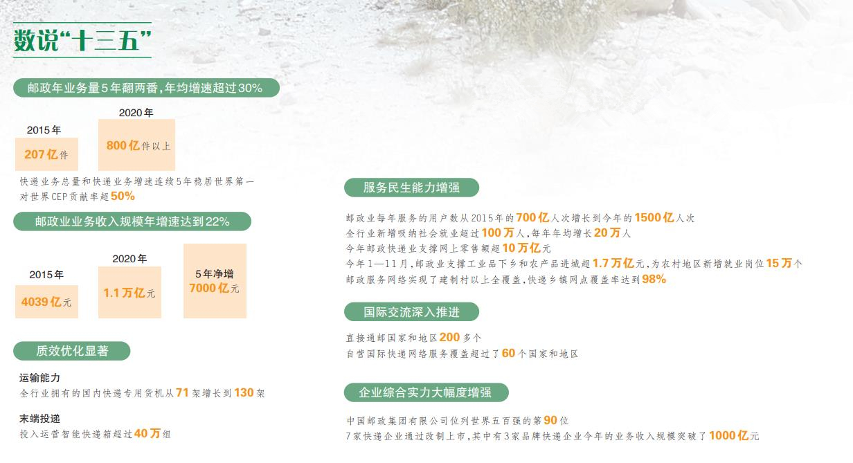 5年来,邮政业发展突飞猛进。快递年业务量从2015年的207亿件增长到今年的800亿件以上,5年翻了两番。我国包裹快递量超过了美国、日本、欧洲等发达经济体总和,对世界CEP(快递包裹)市场贡献率超过了50%。2019年,中国邮政行业业务收入累计完成9642.5亿元,与此同时,城市末端智能快件箱的市场需求快速增长,农村邮政服务网络及扶贫成果引人瞩目……回望“十三五”,邮政业拔节孕穗、硕果累累。坐上驶向人民美好生活的邮车,一幅幅美妙的图景不断闪现。