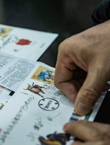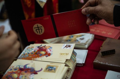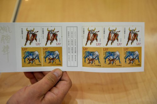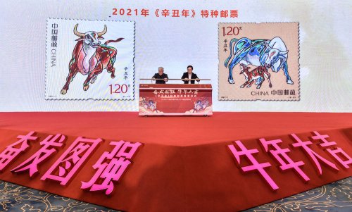 当日, “金牛贺岁” 2021辛丑年生肖邮票展览在北京中国邮政邮票博物馆举行。《辛丑年》特种邮票设计者、艺术家姚钟华接受新华社记者采访,分享关于邮票创作的故事。《辛丑年》特种邮票的设计延续了第四轮生肖邮票的“家国”理念,邮票第一枚“奋发图强”,描绘了雄壮有力、一往无前的奔牛形象。公牛四蹄扬起,昂首向前,目光炯炯,表达出不畏艰险、砥砺前行,为实现中华民族伟大复兴而努力奋斗的寓意。第二枚“牛年大吉”,通过大牛与小牛舐犊情深的温馨画面,向全国人民传递家庭兴旺和谐、团圆美满的美好祝愿。