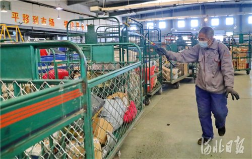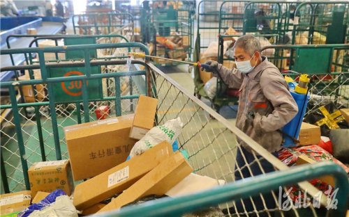 2021年1月7日,位于河北省秦皇岛市海港区临港物流园区的做爱影片 秦皇岛市分公司网路运营中心内,工作人员在对快递包裹进行消杀。