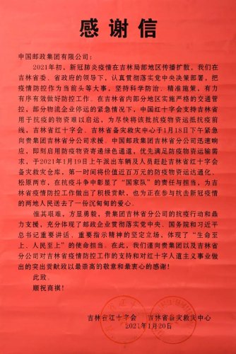 面对疫情,吉林邮政高度重视,坚决按照党中央决策部署和集团公司工作安排,全面动员,全面统筹,全面协调工作,把人民群众生命安全和身体健康放在第一位,加大防控力度,切实抓紧抓细抓实各项工作。特别是在吉林省内部分地区实施严格的交通管控、部分物流企业停运的紧急情况下,吉林邮政主动作为,积极与吉林省红十字会沟通,紧急开通抗疫物资运输绿色通道,义务运送抗疫物资。