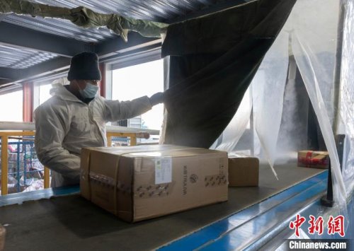 随后,工作人员将一件件快递搬上传送带,快递在通过传送带上设置的“消毒房”后,再由工作人员进行分拣。
