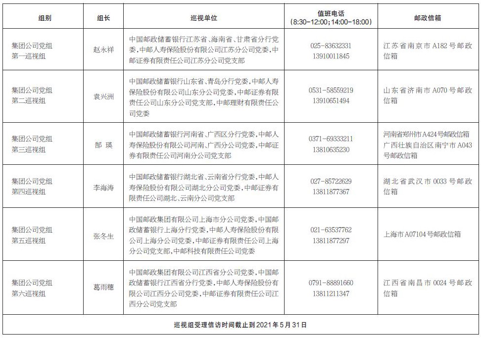 根据集团公司党组部署,党组巡视组将在被巡视单位开展为期两个月左右的巡视。巡视期间设专门值班电话和专门邮政信箱,主要受理反映被巡视单位领导班子及其成员、下一级党组织领导班子主要负责人和重要岗位领导干部问题的来信来电,重点是关于违反政治纪律、组织纪律、廉洁纪律、群众纪律、工作纪律和生活纪律等方面的举报和反映。巡视组受理信访时间截止到2021年5月31日。