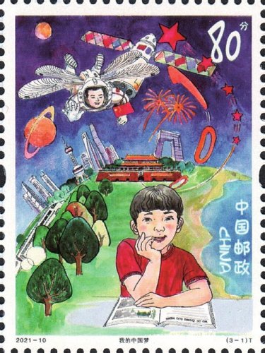 登上《儿童画作品选》特种邮票的3幅作品“我的中国梦”“国粹之韵”和“希望与梦想”,分别由上海市同济小学的杨晓芒、合肥新站寿春实验中学的费玉婷、上海市周浦第三小学的钱昕逸3位小朋友设计。第一枚通过描绘我国航空航天事业、城市、交通网络繁荣发展等场景,表达了少年儿童不断追寻探索宇宙的梦想以及对未来美好生活的憧憬;第二枚描绘了传统文化与城市发展、现代科技共繁荣的场景,表达了少年儿童对中华优秀文化的热爱与传承;第三枚描绘了伟大祖国不断发展的场景,少年儿童登高望远、憧憬未来。三枚邮票紧密围绕主题,展现出少年儿童对党领导下的伟大祖国的无比热爱、由衷礼赞和美好祝愿。