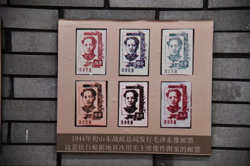 山东战邮纪念馆内, 首次用毛主席像作图案的邮票,被摆放在一进门的位置,被作为镇馆之宝。原山东省邮电管理局史志办公室退休干部扈德玉曾参与编辑《中国解放区邮票史·华东卷(上)》,广泛搜集战邮资料,他说,抗日战争时期,在党中央的正确领导下,抗日战争取得了可喜的成绩,毛泽东被人们崇敬,因此要发行这套邮票。据他向胶东战邮管理局监印员于安了解,该套邮票是在胶东的《大众报》印刷厂印刷,不仅是中国首套,也是世界首套用毛主席像作图案的邮票。