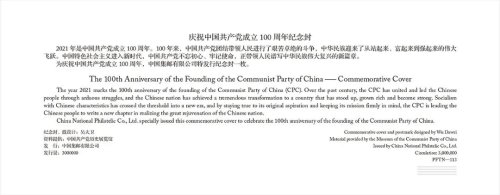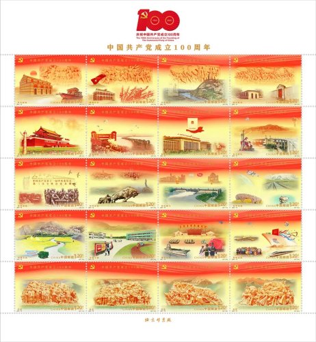按照中国共产党成立100周年庆祝活动安排,经报请党中央批准,中国邮政将于2021年7月1日发行《中国共产党成立100周年》纪念邮票1套20枚,纪念封1套1枚。此次活动发布了纪念邮票的详细信息,内容分别为:1.开天辟地;2.峥嵘岁月;3.中流砥柱;4.伟大胜利;5.开国大典;6.抗美援朝;7.制度奠基;8.自力更生;9.改革春潮;10.对外开放;11.世纪腾飞;12.科学发展;13.摆脱贫困;14.全面小康;15.强军兴军;16.扬帆远航;17.信仰;18.伟业;19.攻坚;20.追梦。邮票采用连票设计形式,以红色、金色为画面主基调,运用油画写实手法表现,并采用连绵不断的飘带贯穿整体,寓意中国共产党百年奋斗的光辉历程。该套邮票特别使用两色红荧光油墨,在紫光灯下,庆祝建党百年标识、“一大会址”、“天安门”等邮票主体元素闪放璀璨的光芒。