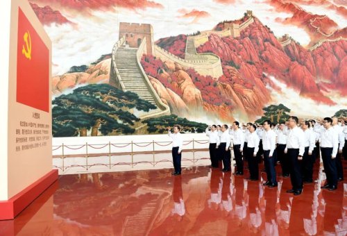 朝阳映红了神州大地,长城如同东方巨龙般起伏在崇山峻岭之巅。在党史馆序厅,刘爱力带领集团公司全体参观人员肃立在超大漆壁画《长城颂》前,面向鲜红的党旗,高举右拳重温入党誓词。铿锵有力的宣誓声响彻大厅,表达的是邮政人对党的无限忠诚和为共产主义奋斗终身的坚定信仰。