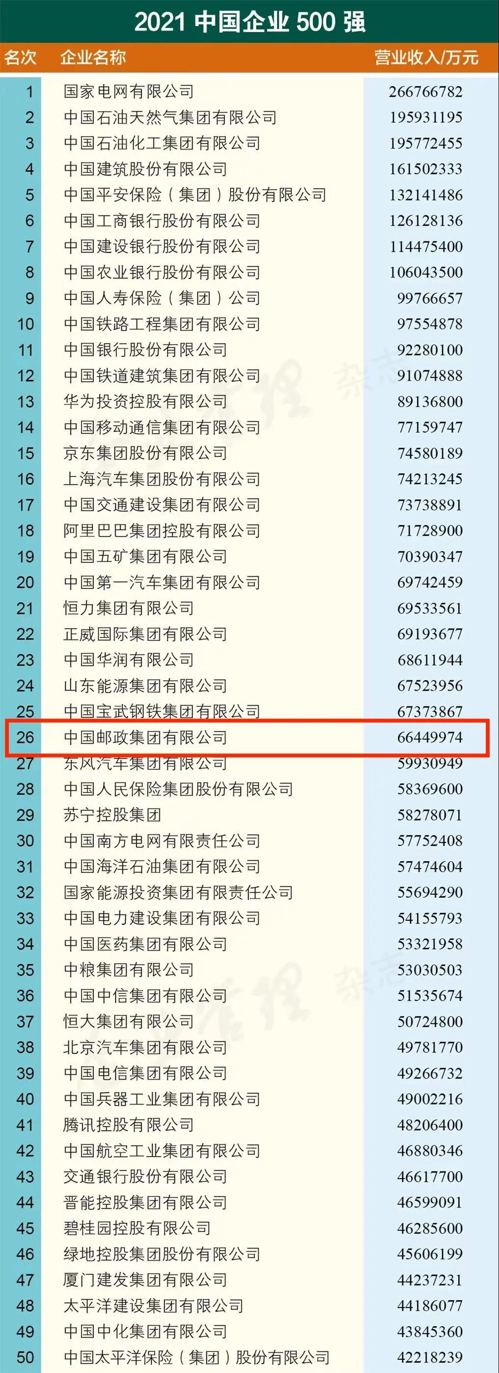 此前,在今年的《财富》世界500强榜单上,中国邮政排名升至第74位,首次挺进世界前80强。