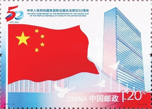 10月25日,中国邮政发行《中华人民共和国恢复联合国合法席位50周年》纪念邮票一套1枚,全套邮票面值1.20元。邮票计划发行数量为700万套。