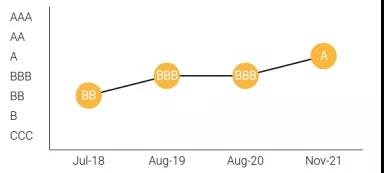 邮储银行2018-2021年MSCI ESG评级提升情况,图片来源:MSCI ESG报告
