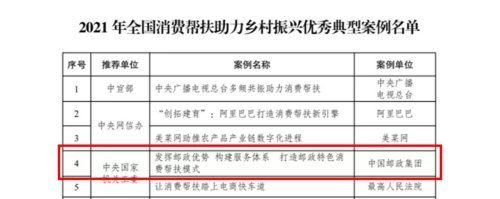 12月2日,在国家发改委召开的2021年全国消费帮扶助力乡村振兴典型案例视频推介会上,54家单位获评2021年全国消费帮扶助力乡村振兴优秀典型案例,中国邮政荣膺其中。