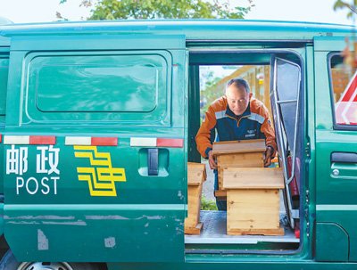在浙江省湖州市长兴县,林城镇邮政所蜂产业专职投递员王国庆把要寄递的蜂箱搬上快递车。 许斌华摄(影像中国)