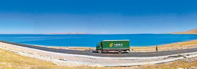 邮车从青藏高原色林错湖畔驶过。旦巴扎西摄(人民视觉)
