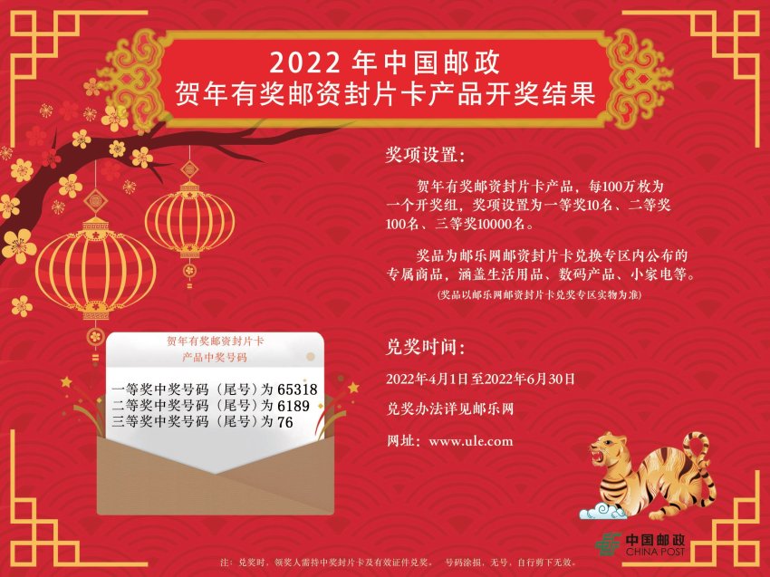 2022年贺年有奖邮资封片卡中奖号码于3月18日产生。现将中奖信息通知如下: