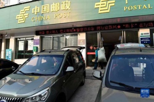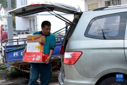 10月28日,在太湖县北中镇莲花村,吴义阳将村民寄出的包裹搬运上车。