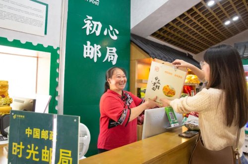 石柱县分公司文化传媒中心负责人向志华介绍,初心邮局在布置方面融入了党建、石柱、本土文化、农特产品等众多元素,两层楼构造,一层展示当地的农特产品,比如中益土蜂蜜、盐竹笋、红辣椒等;二层通过纪念邮票区、家书初心区、文创产品区,提供特色邮政服务。“主题邮局取名初心邮局,一方面是契合当地初心小院、初心广场的主题,另一方面也是展示‘人民邮政为人民’的初心。”