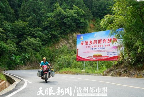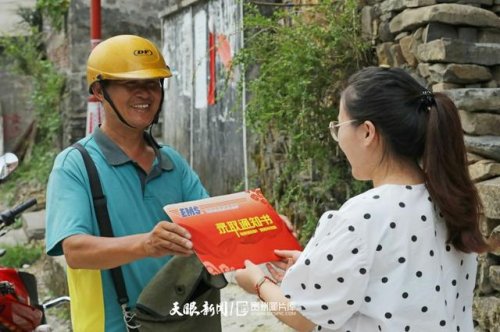 8月的青山界山麓酷热难耐,午饭后,大多村民都宅家聊家常、睡午觉。此时,身穿绿色工服、头戴红色安全帽的中国邮政集团锦屏县分公司乡邮投递员张林昌,正骑行在各村寨间投送邮件。