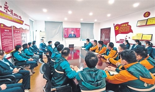 浙江省湖州市邮政分公司织里快包揽投部员工认真收看党的二十大开幕会直播。□钱云杰 摄影报道