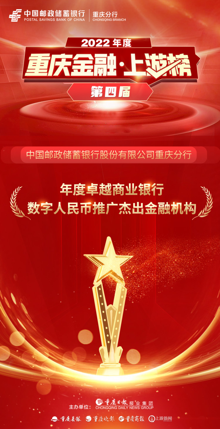 备受业界关注的2022年“重庆金融·上游榜”评选结果在今天正式揭晓。中国邮政储蓄银行(以下简称“邮储银行”)重庆分行凭借年度市场表现与行业影响力,荣膺“年度卓越商业银行”综合大奖。同时,该行扎实稳妥推进数字人民币试点工作,在场景应用、对公及个人钱包数量等方面坚持数字化转型,积极探索创新斩获“数字人民币推广杰出金融机构”特别奖。