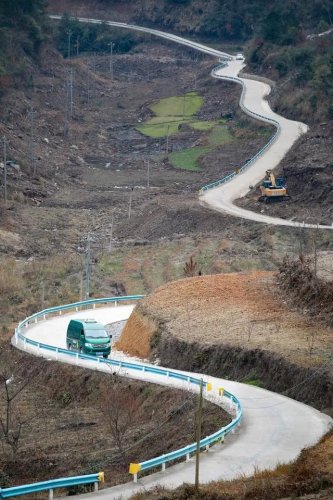 莫富元驾驶小货车在通往龙里县平西村的山间道路上行驶(2月14日摄)。