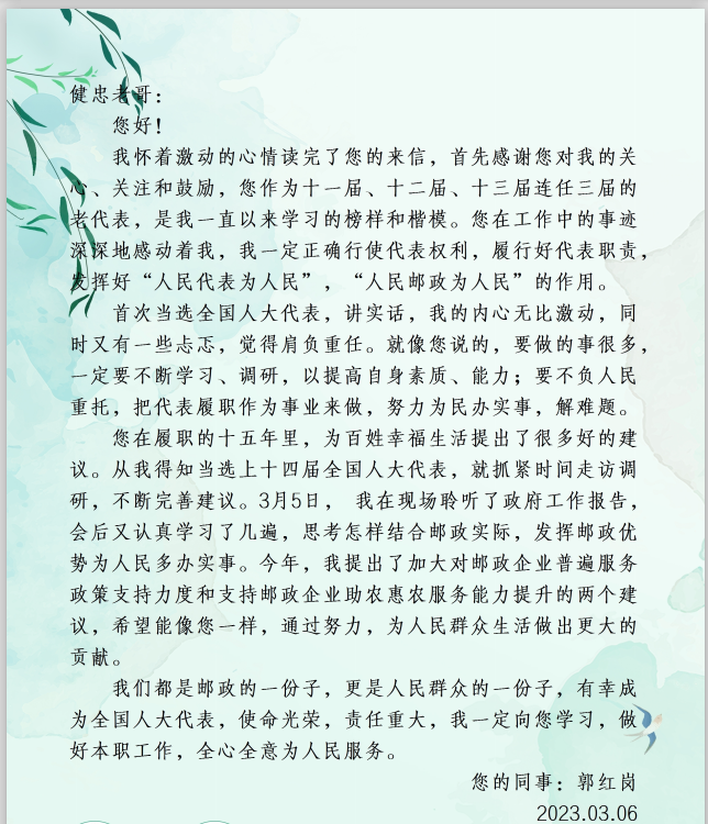 当晚,何健忠怀着一名老代表的责任感,拿出纸笔在案头奋笔疾书,用传统的书信形式、也代表着邮政人的仪式感,给两位邮政系统新当选的全国人大代表郭红岗、莫富元送上了殷殷寄语。